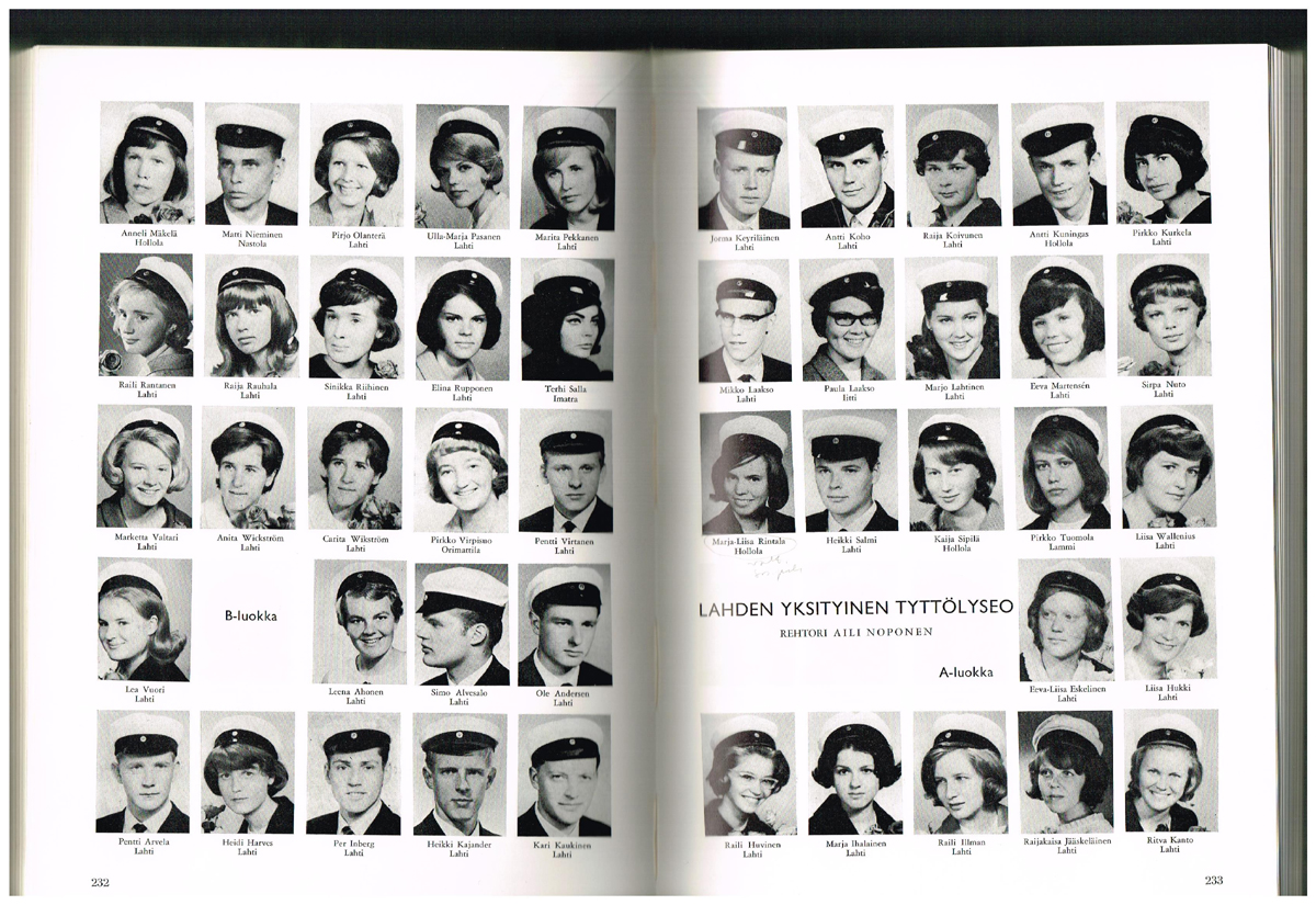 TUTUT JA PUOLITUTUT PUOLEN VUOSISADAN TAKAA - VASEMMALLA: Elina Rupposen isosisko Sirpa oli Kivimaalla luokallani 50-luvulla * Terhi Sallan tulon yhteiskoulun oppilaaksi huomasi jokainen lyseon poika, eksoottinen lappalaiskaunotar Imatralta * Ahosen Lettu ja Andersenin Ole kauppaopistossa samalla luokalla kanssani. OIKEALLA: Koivusen Raijakin kauppaopistossa luokallamme * Liisa Wallenius, eli 'Tuttu', oli lapsuudenkavereitteni Pellen ja Jussin pikkusisko Kariniemestä * Tipalan tytöistä Hukin Liisa asui Kariniemenkadulla, kävelimme joskus ympäri luonnonpuistoa, kävin heillä kotonakin. Liisa meni naimisiin luokkaverini jalkapalloilija Semi Nuorasen kanssa ja hänestä tuli kieltenopettaja kauppaopistoon. |