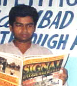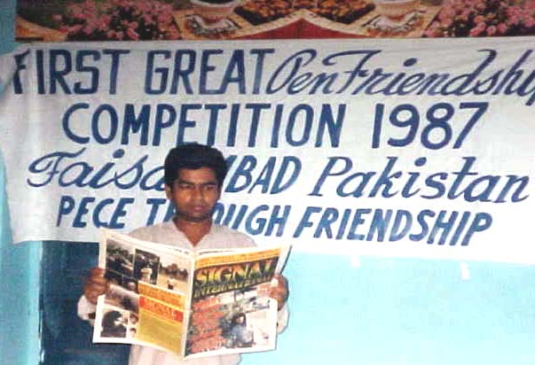 Abdul Bari reading Signal 62 of 1985 in the "First Great PenFriendship Competition 1987 Faisalabal Pakistan, Peace through Friendship" exhibition.